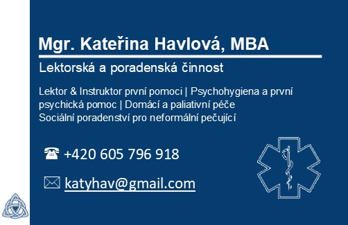 Pro lektorskou a poradenskou činnost v oblasti koučinku, vzdělávání a poradenství ve první pomoci, péči a psychohygieny mě můžete kontaktovat nejlépe e-mailem: